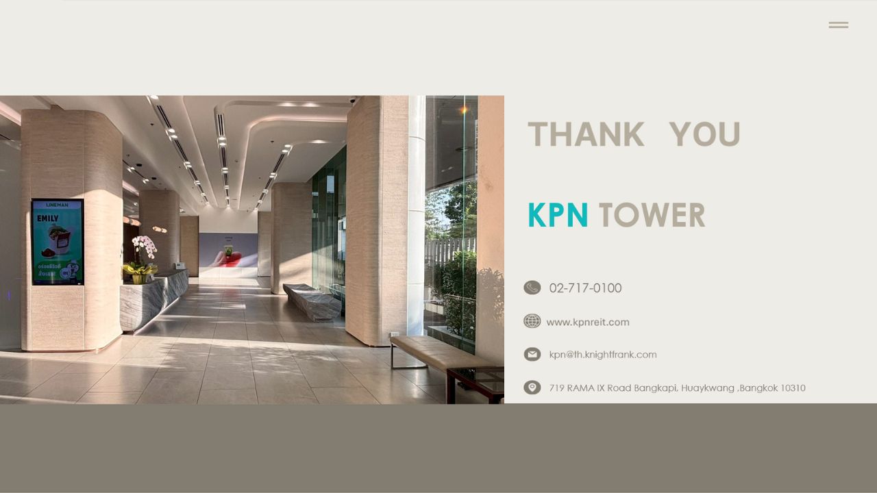 Project KPN TOWER office building , which is located on RAMA IX Road. Easy Access to Many, Just 15 minutes away from the airport and the nearby attractions and amenities such as shopping malls, public place, Banks and hospitals.