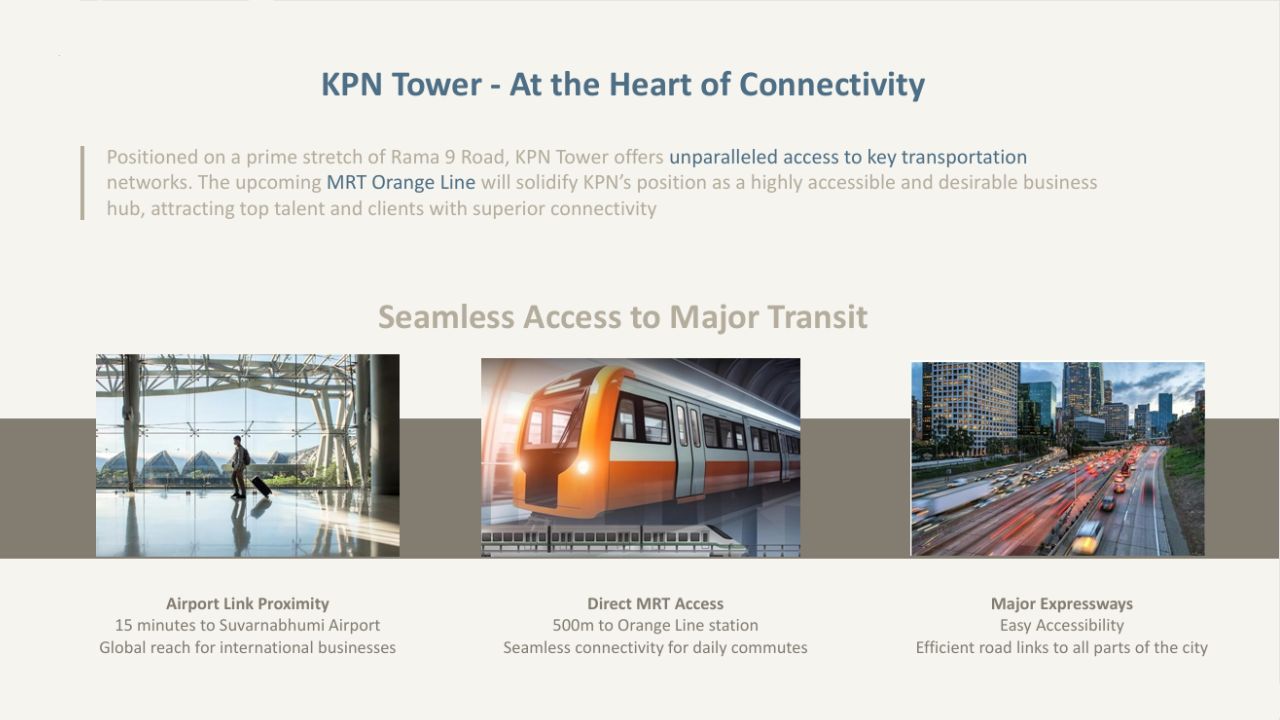 KPN商业大厦位于地铁橙色线,在MRTA站和Pradittharam Manutham站之间。让旅行更轻松,更舒适。